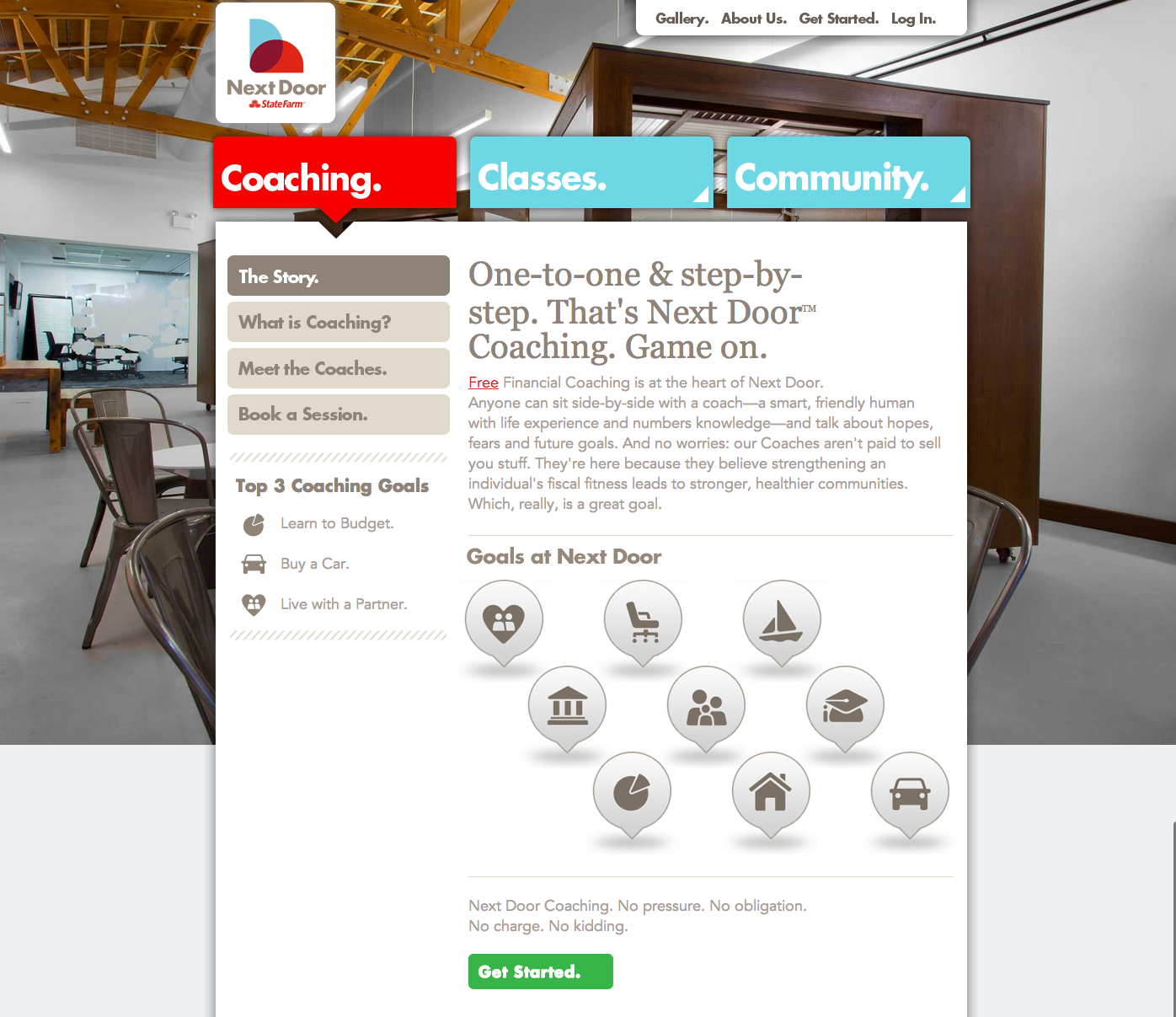 In collaboration with State Farm, I worked with a team of architects, writers, business stragists and designers to craft a physical space with several service offerings for young to middle-aged adults in need of financial and life planning advice. The space also existed to be a community hub for locals to meet, participate in workshops or reserve space for their own events. I worked on the digital tools including the website (mobile and desktop), a large-scale digital community events board and collaborated on an iPad coaching tool for advisors to use. Next Door launched in 2010 and is thriving.