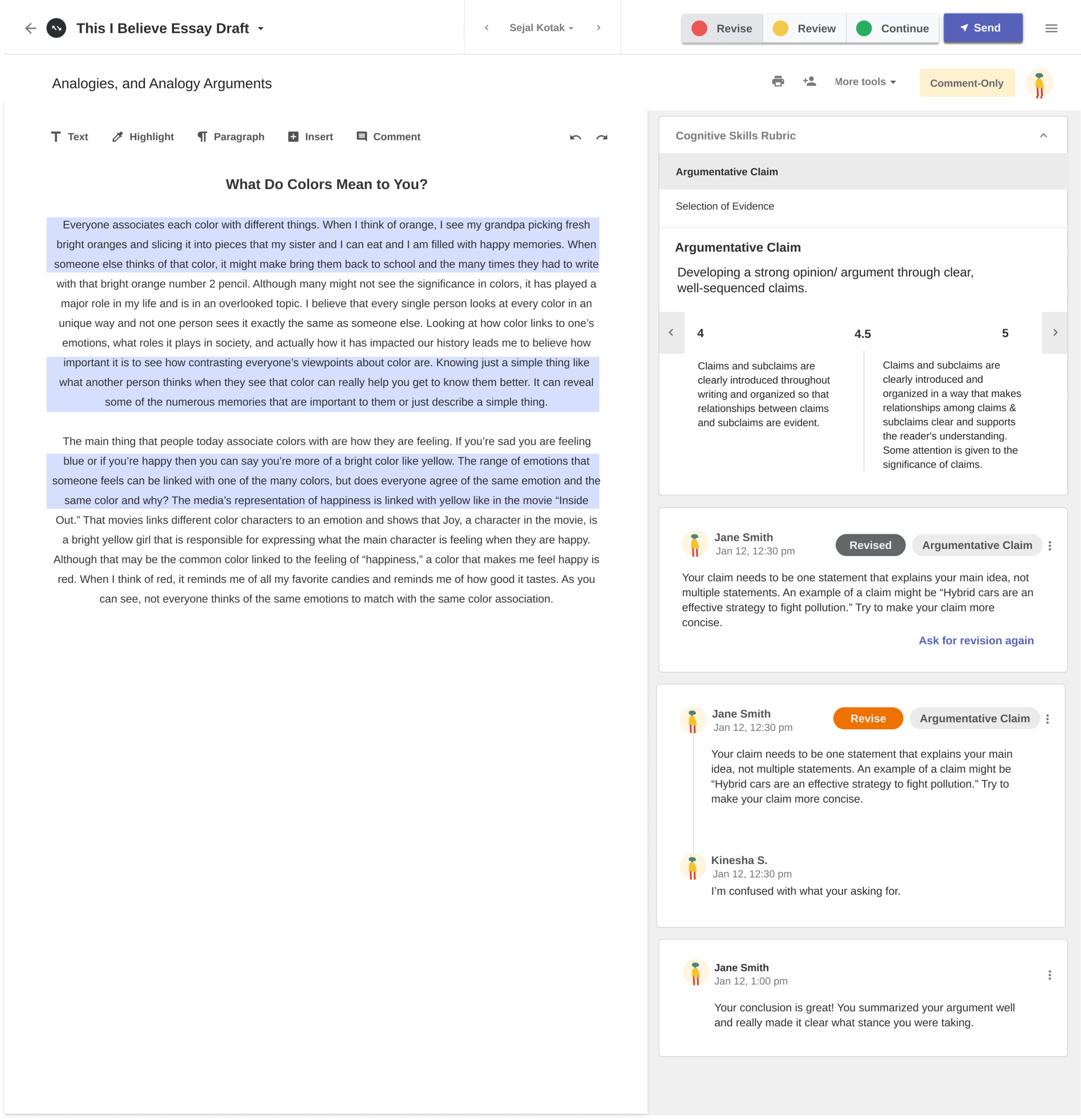 Showing the the previous version of text within a comment card was selected also a highly desired concept by teachers since they had no version history to see what had changed